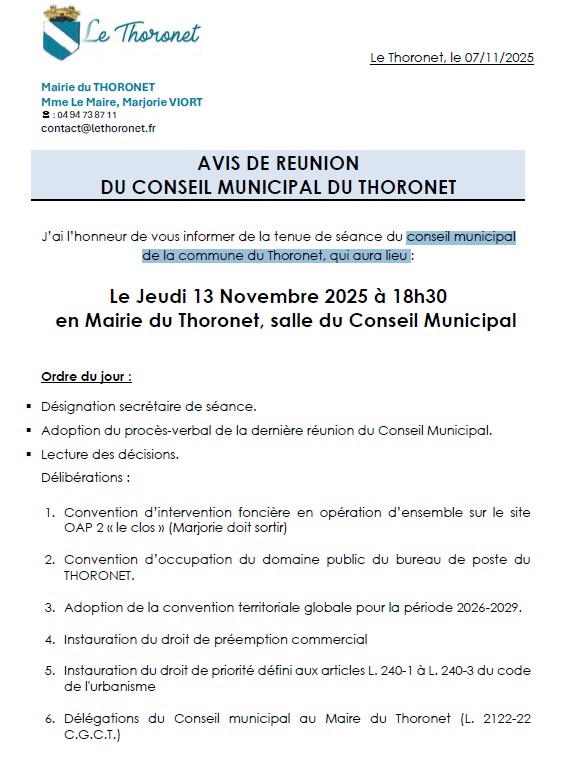 Le prochain conseil municipal de la commune du Thoronet se tiendra jeudi 13 novembre 2025 à 18h30 dans la salle du conseil municipal.